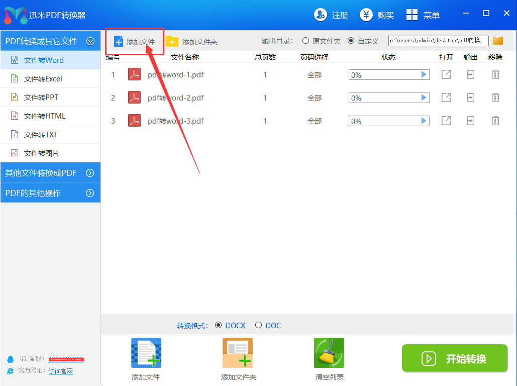 步骤1,下载安装迅米PDF转换器后打开,然后点击左边第一个功能列表下的“文件转word”功能。