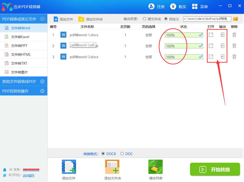 步骤3,软件右上方设置转换后word文件的保存路径,再设置word文件的输出格式doc或者docx,如果没有别的设置了就点击【开始转换】按钮,启动程序。