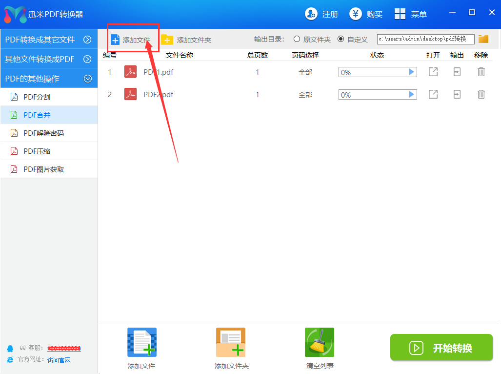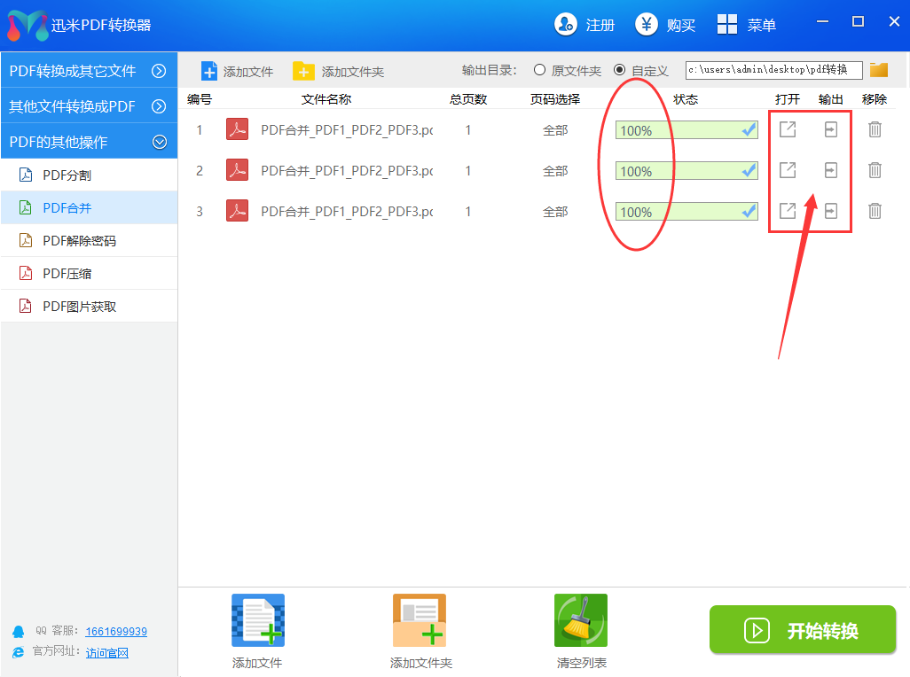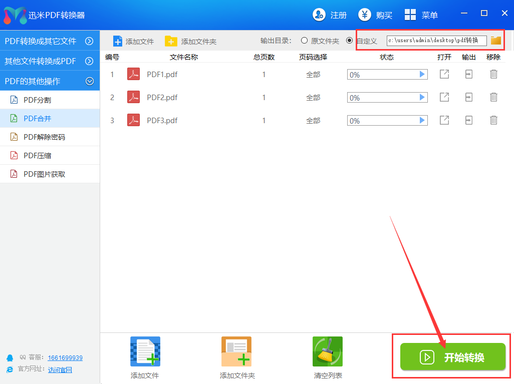 步骤3,文件调整好之后,可以设置一下合并文件的保存目录。确认没有其它设置需求的前提下,点击软件右下角的“开始转换”按钮即可。