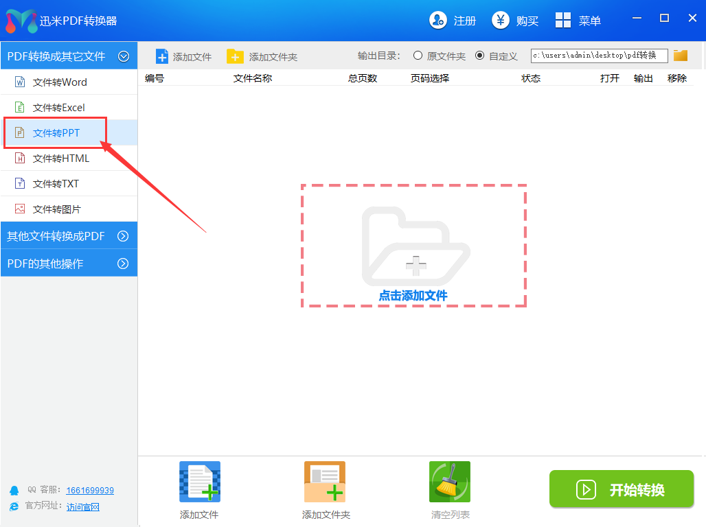 步骤1,下载“迅米PDF转换器”后安装打开,依次点击软件界面左边的【PDF转换成其它文件】-【文件转PPT】功能。