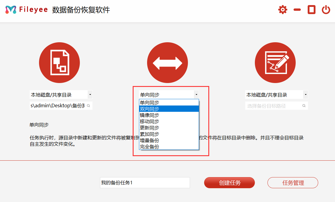 步骤二,然后,选择文件传输的方式。目前,FileYee有多种方式,包括:单向同步、双向同步、增量同步、镜像同步、移动同步等等。简单一点的备份,可以直接勾选“单向备份”;