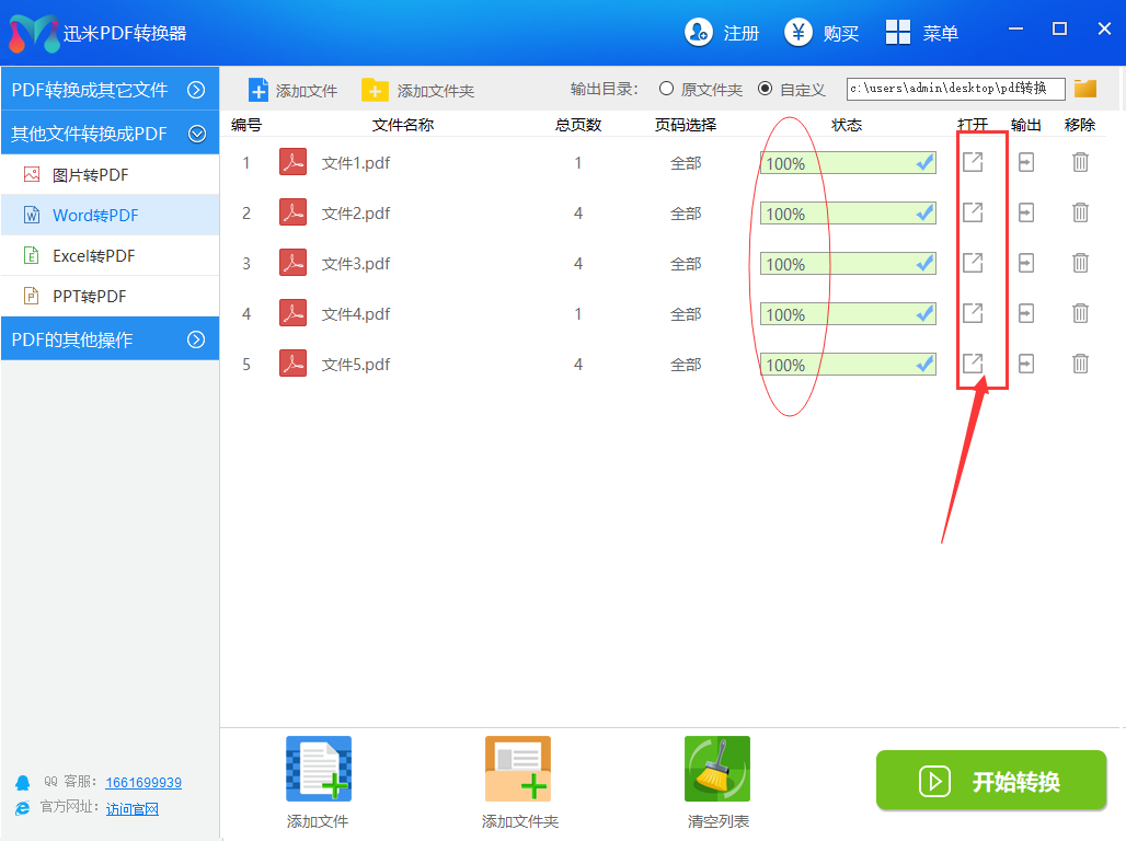 步骤3,当所有文件名称右边的进度条变成100%的时候,说明转换完成,点击右边的“打开”图标按钮,就可以查看转换后的pdf文件了。