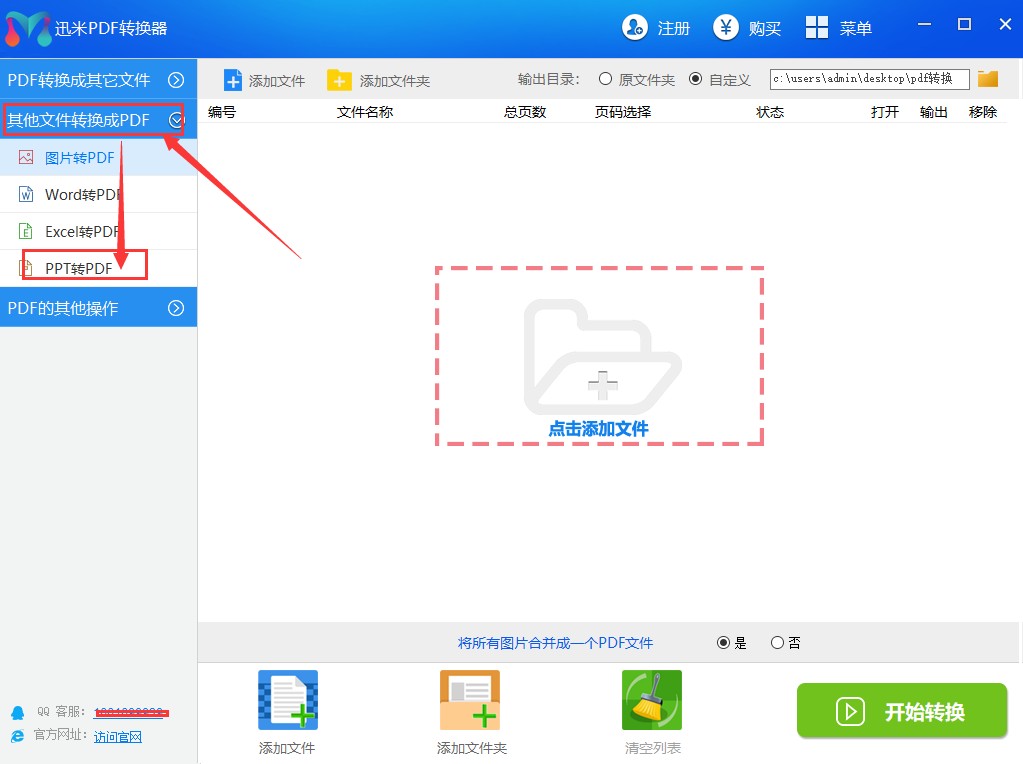 步骤1,打开工具中的迅米PDF转换器,然后打开第二个主功能【其他文件转换成PDF】,然后点击【ppt转pdf】功能,进入下一步操作。