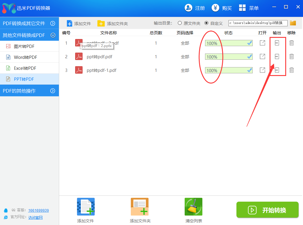 步骤4,当文件名称右边对应的转换进度条变成100%的时候,说明这个PPT文件成功的转换成了pdf文档,点击右边的“输出”图标按钮,就能查看到这个PDF文件了。