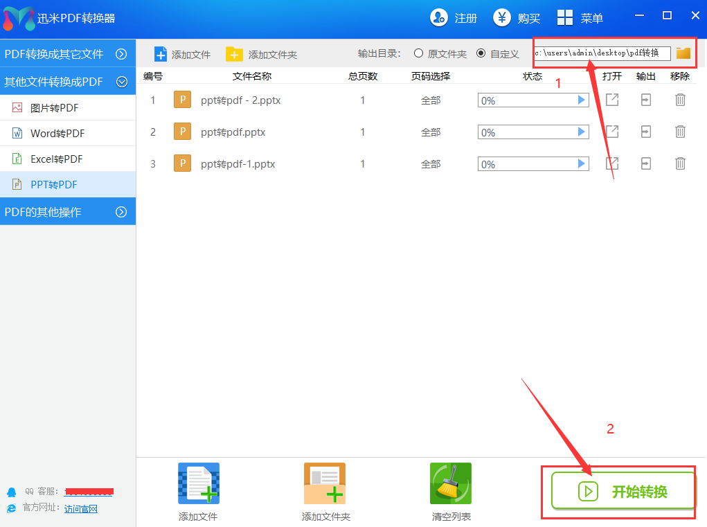 步骤3,如下图所示软件右上角位置设置转换后pdf文件的保存路径,然后点击下方的【开始转换】绿色按钮,启动转换。
