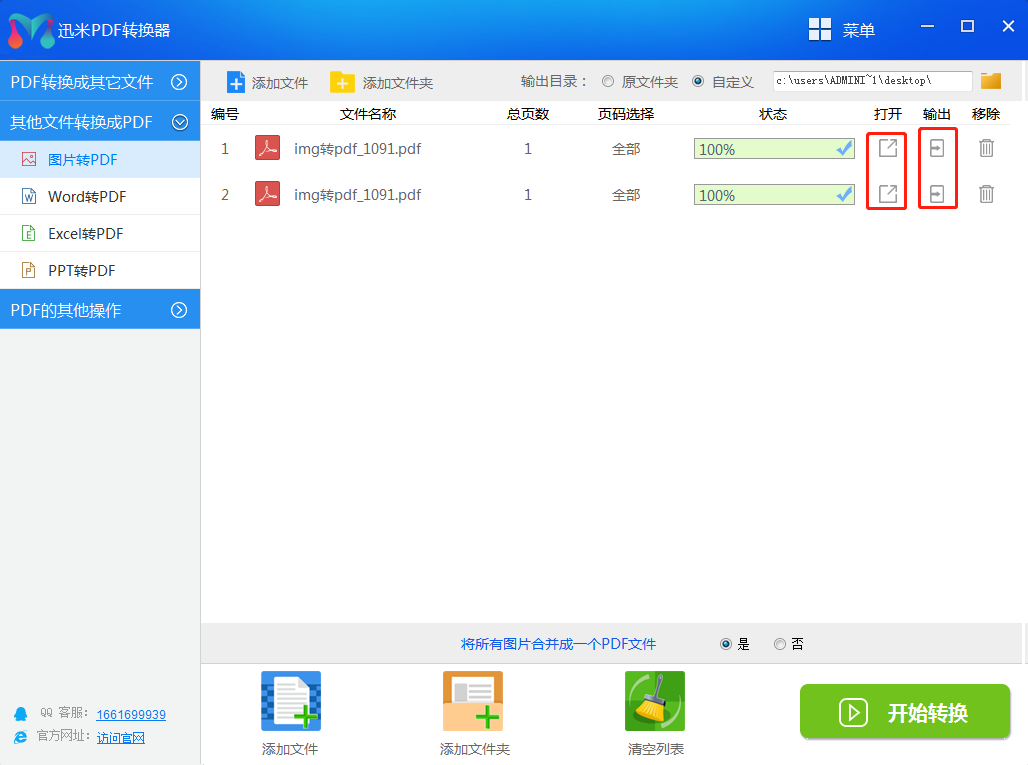 步骤5、如下图所示,点击右侧的打开按钮即可打开转换成的PDF文件,点击右侧输出按钮即可打开所在文件夹。