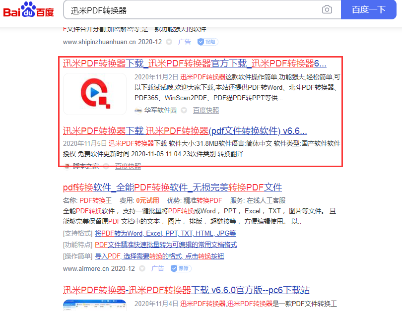 步骤1、下载迅米PDF转换器并安装,可通过上文中的下载链接下载,也可以在百度中搜索“迅米PDF转换器”进行下载,软件安全无毒,请放心安装。