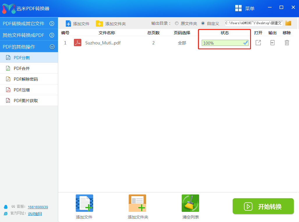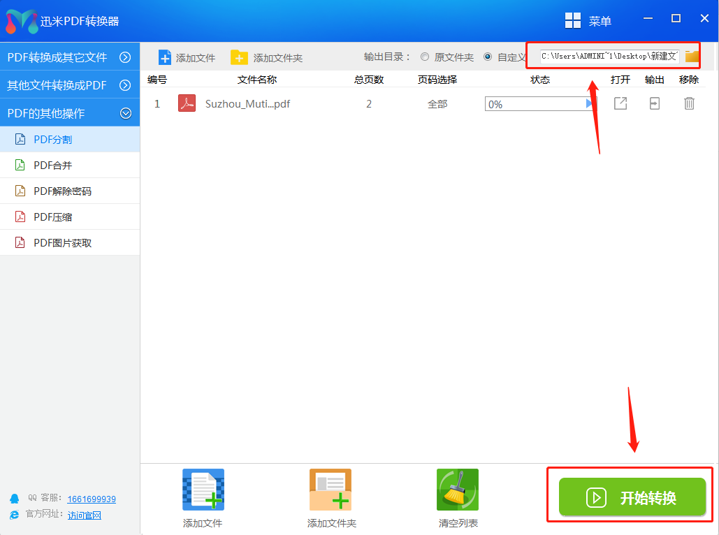 步骤3、添加完文件后,在软件右上角处设置文件拆分后的保存路径。然后点击右下角“开始转换”按钮,开启PDF拆分操作。
