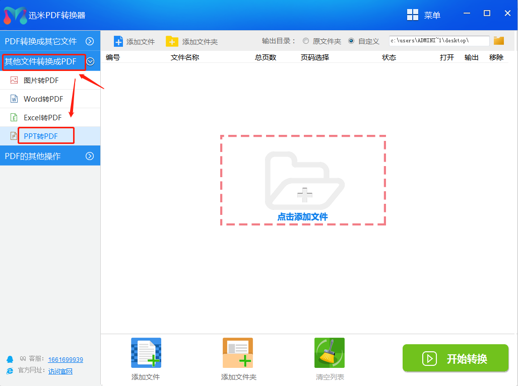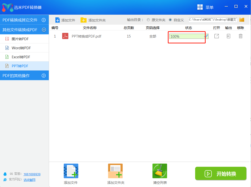 第3步:在左上角设置转换后PDF文件的保存位置,然后点击右下角的“开始转换”按钮,启动PPT转PDF文件操作。