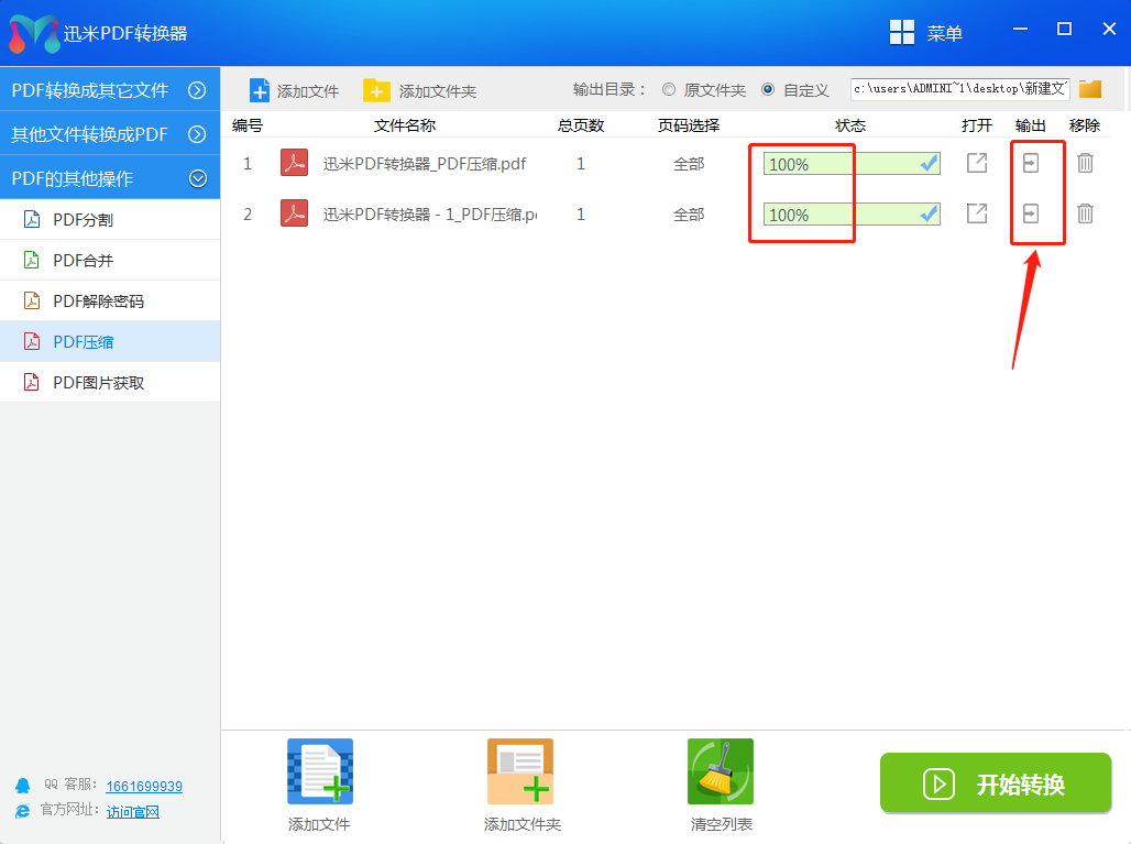步骤4、当软件状态栏的转换进度条显示未100%时说明PDF文件已经压缩成功了,点击右侧的“输出”图标按钮,就能够打开压缩后文件所在的文件夹。